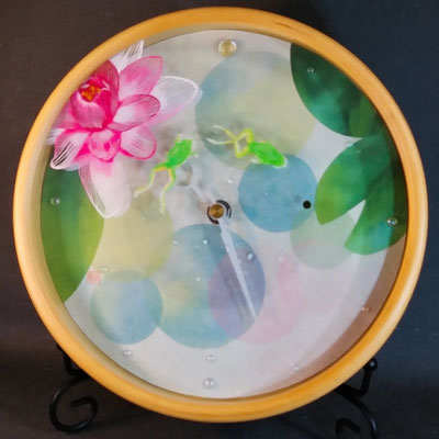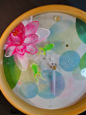 睡蓮部分、文字盤、カエル部分、すべて切り絵の原画です。